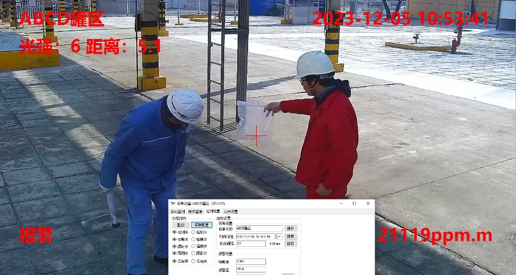 In the ABCD tank farm, at the moment of simulated leakage, the device immediately displayed a concentration value of 21119 ppm·m, and the alarm was triggered in only 0.3 seconds.